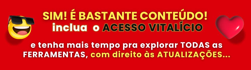 ACESSO VITALÍCIO ao PACK de FERRAMENTAS: 🌟Com o VITALÍCIO ❤️ você garante todas as ATUALIZAÇÕES do DRIVE e aproveita MELHOR o seu Pack por tempo INDETERMINADO.🌟 Sem Vitalício o acesso Normal vale por 1 Ano.